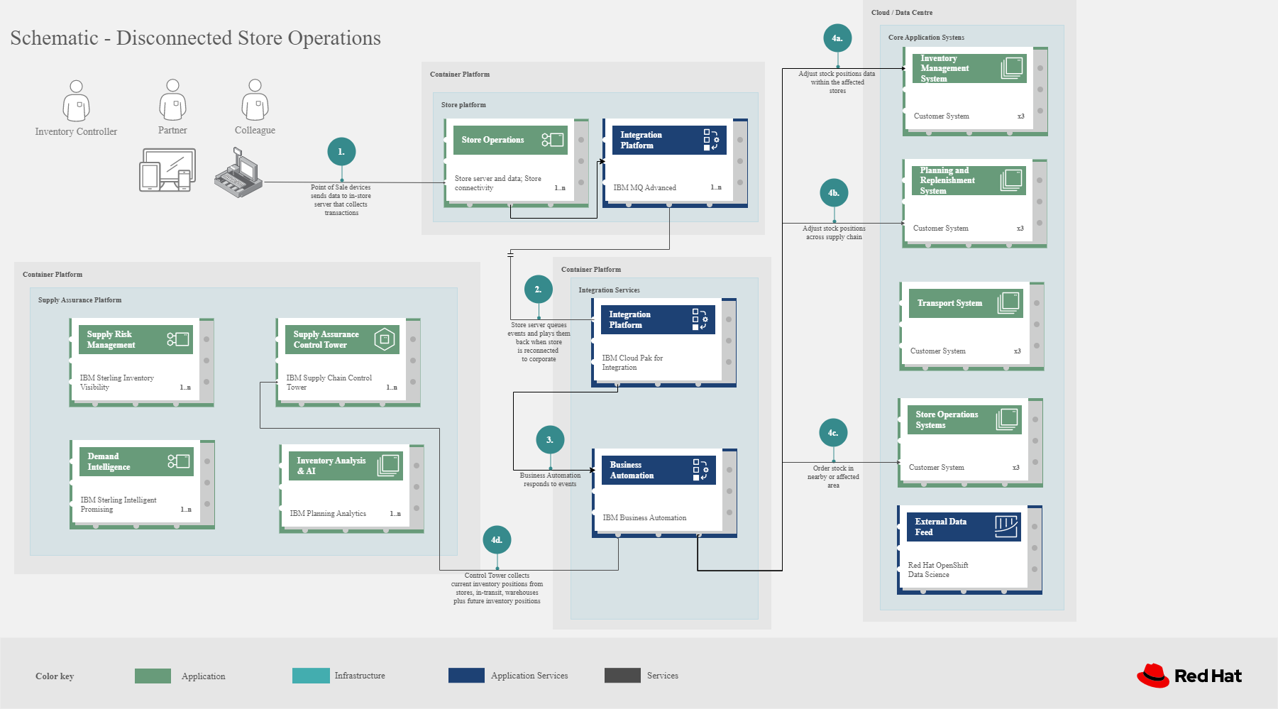 - Foundational infrastructure. The Red Hat/IBM solution is built on Red Hat OpenShift with data routed through API management and events routed through business automation tools such as Business Automation Workshop.